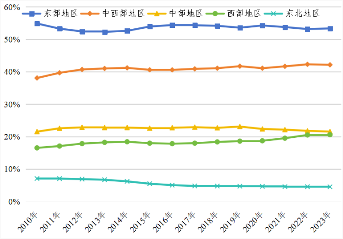 产业转移是优化要素资源空间配置、有助于区域协调开展和共同富裕的重要政策载体与实施路径。2024年9月出台的《中共中央 国务院关于实施就业优先战略促进高质量充分就业的意见》提出,要“引导资金、技术、劳动密集型产业从东部向中西部、从中心城市向腹地有序转移”。从进展来看,东部向中西部产业转移已进入实质性阶段,资源、劳动密集型产业成为转移主力。然而,中西部和东北地区在产业承接过程中暴露出区域产业吸引力不足、流通体系不健全、产业开展要素保障不足、产业合作平台能级偏低、对外开放能力薄弱等短板,导致转移进度与预期目标存在明显差距。下一步,要精准施策引导产业布局、优化营商环境、推进流通体系和产业合作载体建设、强化产业配套要素保障,持续参与国际产业合作,促进中西部和东北地区“接得住、留得下、开展好”转移产业。 一、中西部和东北地区承接产业转移现状分析 1 产业承接表现存在区域差异 东部地区向中西部产业转移的态势显著,而区域间工业开展差距的变化,直观反映出不同地区的承接能力差异。 自2000年西部大开发战略实施以来,东部产业加快向中西部转移,但随着区域生产要素成本与政策优惠差距逐渐缩小,大规模产业转移的动力有所减弱,转移节奏趋缓。从工业增加值占全国比重看,西部地区表现突出,占比从2010年的16.53%提升至2023年的20.58%,增加4.05个百分点,工业开展能级稳步提升。中部地区占比虽在2019年达峰后略有下降,但始终高于西部和东北地区,仍是产业转移的重要承接区域。 整体而言,中西部地区工业增加值占全国比重呈上升趋势,与东部的差距从2010年的16.79个百分点缩小至2023年的11.17个百分点;而东北地区与东部地区的差距从47.79个百分点扩大至48.83个百分点,进一步凸显了其加快转型升级、扩大产业承接规模的紧迫性。 图1 2010-2023年四大板块工业增加值占全国比重变化趋势 资料来源:国家统计局 2 承接产业以资源密集型和劳动密集型为主 与2008年相比,2023年中西部地区多数制造业细分行业营业收入占全国比重呈上升趋势,而东部地区较多细分行业占全国比重下降。其中,钢铁、有色金属等原材料行业向西部地区转移的态势尤为明显。这得益于西部地区依托资源禀赋和环境承载力的比较优势,持续承接资源密集型产业。具体来看,西部地区石油和天然气开采业占比提升11.83个百分点,内蒙古鄂尔多斯、陕西榆林、宁夏宁东等现代煤化工基地陆续建成,有助于我国石油和化工产业布局持续优化。 图2 2008-2023年各大板块制造业细分行业营收收入占全国比重变化 资料来源:国家统计局 从左到右依次为:1-煤矿开采与洗选业,2-石油和天然气开采业,3-黑色金属矿采选业,4-有色金属矿采选业,5-非金属矿采选业,6-石油、煤炭及其他燃料加工业,7-非金属矿物制品业,8-黑色金属冶炼和压延加工业,9-有色金属冶炼和压延加工业,10-金属制品业。 食品、纺织等制造业从东部地区转出态势显著。其中,酒、饮料和精制茶制造业占全国比重下降11.06个百分点,纺织业、纺织服装服饰业分别下降2.71、5.58个百分点。与此同时,中西部地区承接成效突出:西部地区酒、饮料和精制茶制造业营业收入占全国比重提升18.16个百分点,中部地区纺织服装服饰业提升7.04个百分点。这主要得益于中西部劳动力成本的比较优势,吸引大量劳动密集型产业转移。东北地区则呈现不同态势,装备制造业等行业营业收入占全国比重下滑,通用、专用设备制造业营业收入占全国比重分别降低7.40、5.70个百分点。受市场竞争加剧与环保要求提高影响,东北传统行业承压,老工业基地开展面临更加严峻的挑战。 图3 2008-2023年各大板块制造业细分行业营收收入占全国比重变化 资料来源:国家统计局 从左到右依次为1-农副食品制造业,2-食品制造业,3-酒、饮料和精制茶制造业,4-烟草制品业,5-纺织业,6-纺织服装、服饰业,7-造纸和纸制品业,8-化学原料及化学制品制造业,9-医药制造业,10-化学纤维制造业,11-通用设备制造业,12-专用设备制造业,13-铁路、船舶、航空航天和其他运输设备制造业.。 3 省会城市产业集聚效应明显 中西部地区省会城市凭借城市群与都市圈的区位、政策优势,成为承接东部产业转移的核心地带。该区域省会城市依托这些平台的资源集聚效应,吸引了东部地区转移向省内转移的大部分产业。具体而言,郑州、合肥、西安、贵阳承接产业转移偏向高端化,第二产业增加值占全省比重稳步提升;银川、拉萨依托资源禀赋与西部大开发政策优势,承接特色产业转移成效突出。太原、兰州、西宁、南宁、乌鲁木齐等则因地理区位、产业基础等因素影响,承接产业转移效果稍显不足。 东北地区省会城市中沈阳、哈尔滨承接第二产业转移成效显著,尽管长春第二产业增加值占全省比重有所下降,但依托原有工业基础仍保持高集聚度。 图4 2021-2024年中西部和东北地区省会城市第二产业增加值占全省比重变化(%) 资料来源:国家统计局 4 制造业劳动力成本具备比较优势 四大板块中,东部地区制造业城镇单位就业平均工资均值最高,且劳动力要素成本持续上升,这一趋势倒逼劳动密集型、低附加值产业向中西部转移,促使本地产业向高端装备制造、产品研发设计等附加值高的领域升级。东部地区内部劳动力成本也存在梯度差异。河北